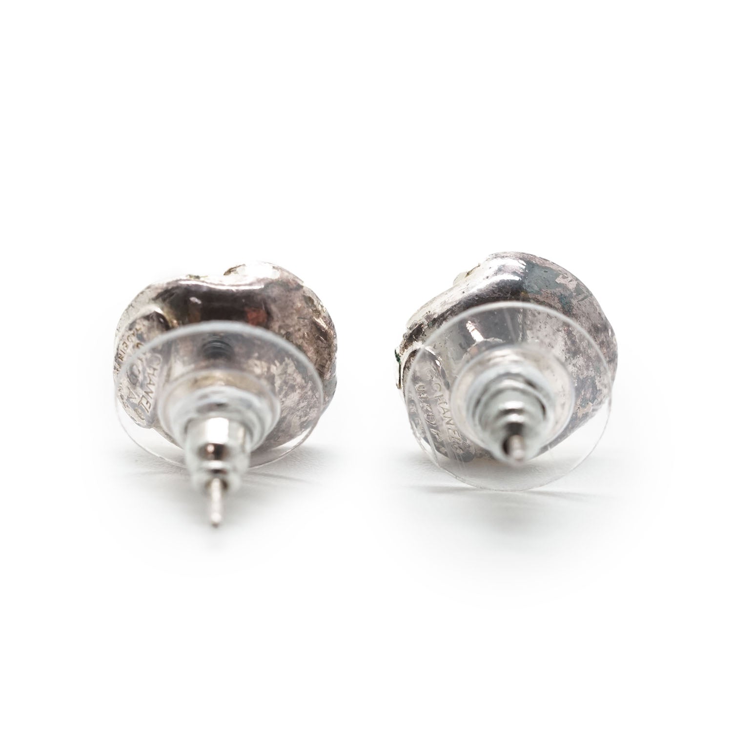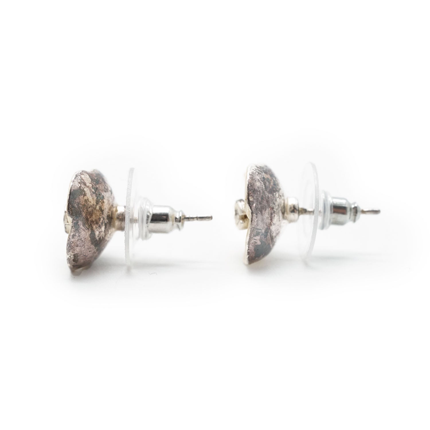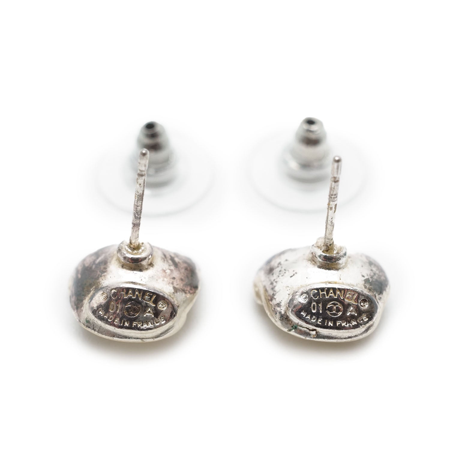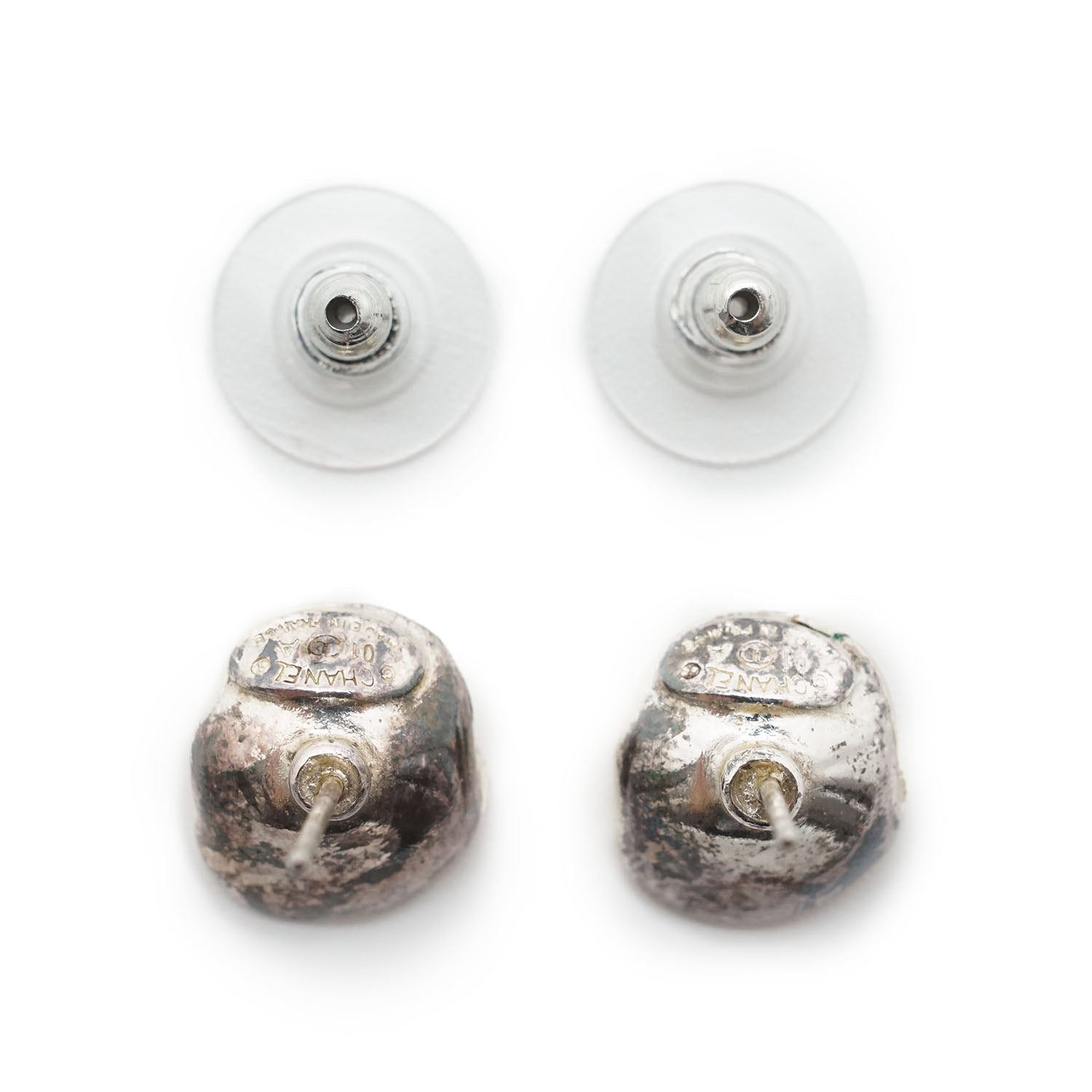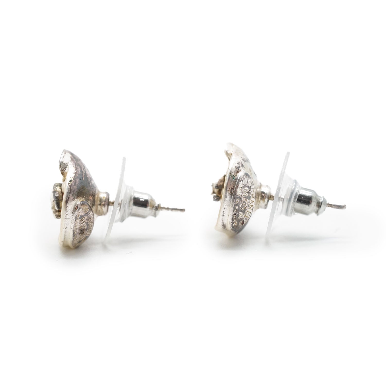 Discoloration: Visible tarnish on the logo and on the back of both earrings