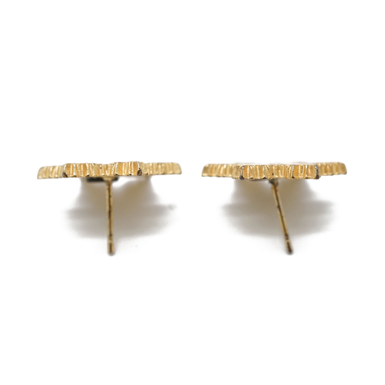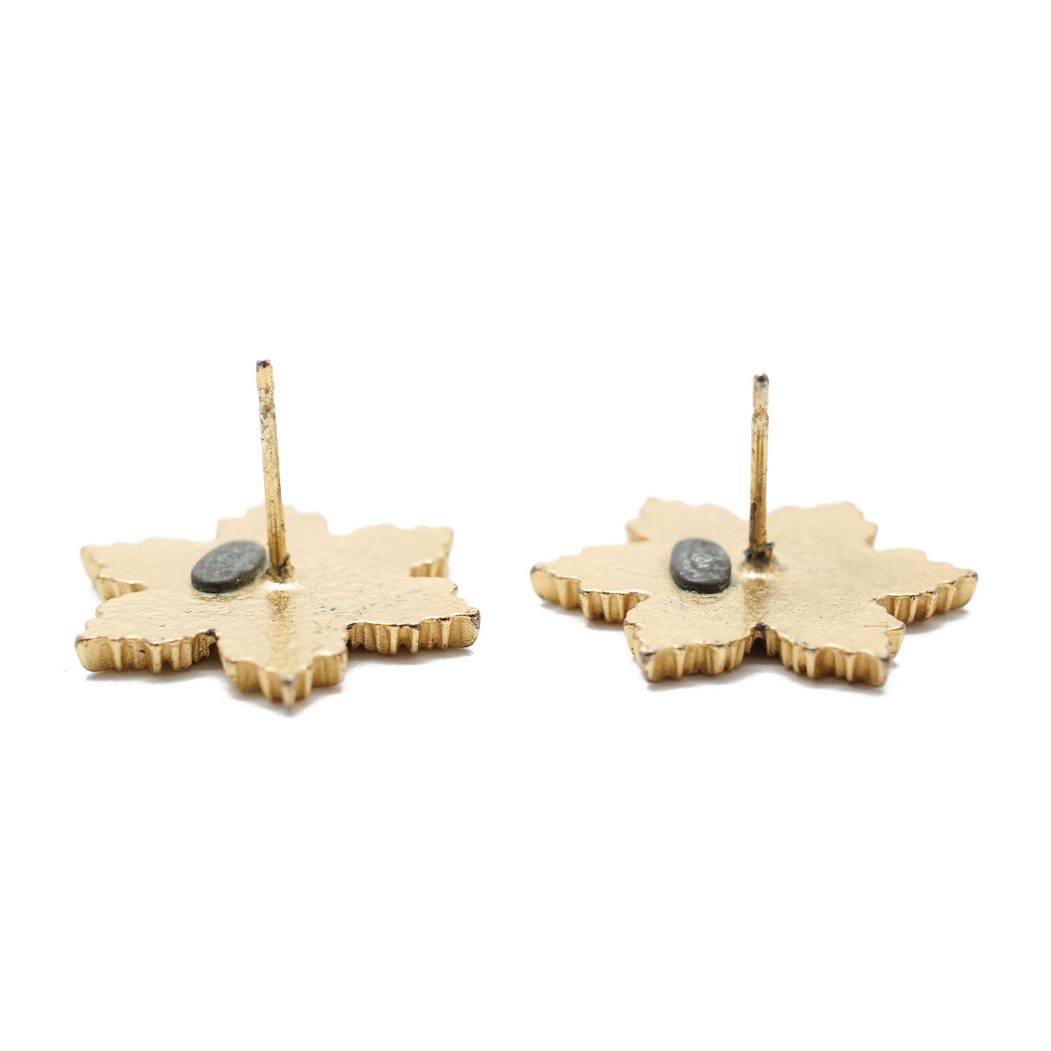 Discoloration: Visible tarnish on the back logo plate of both earrings