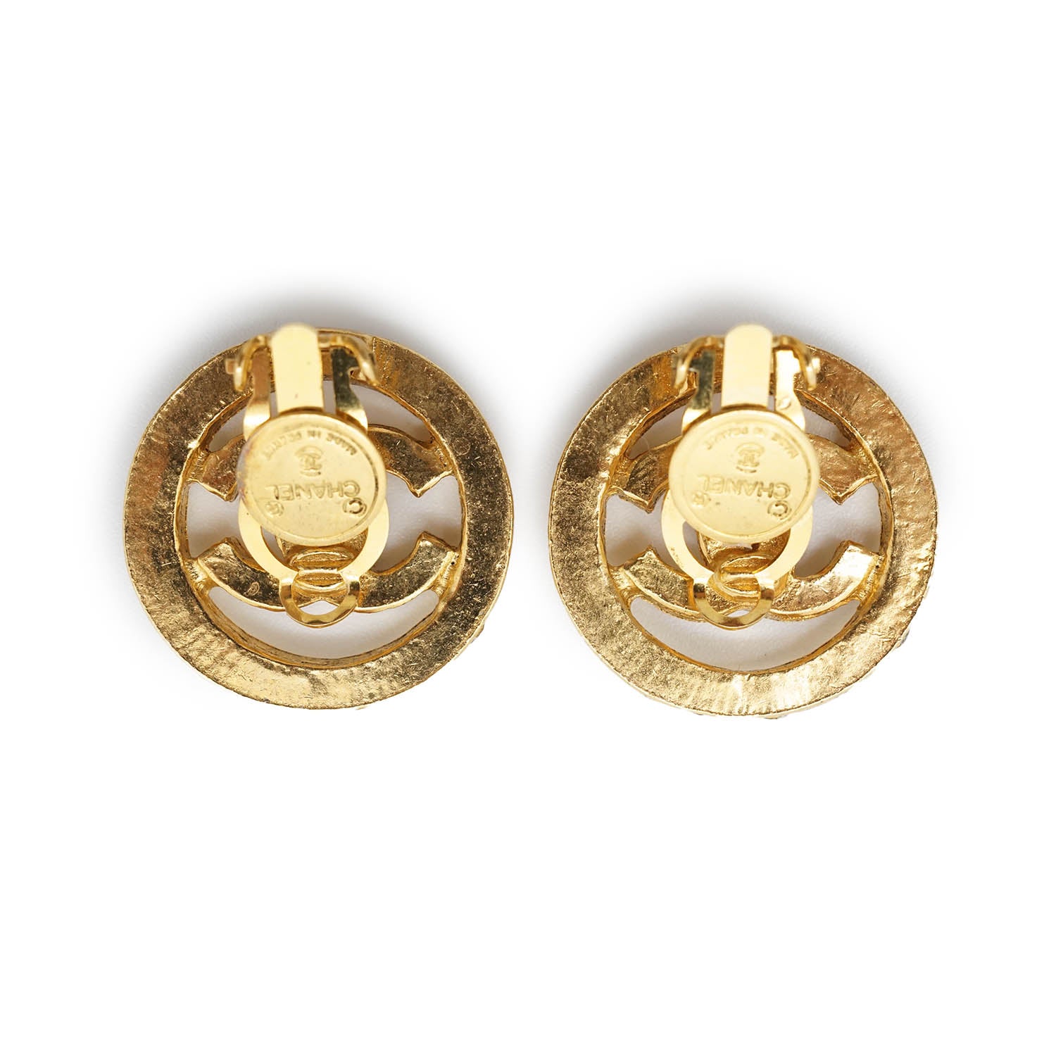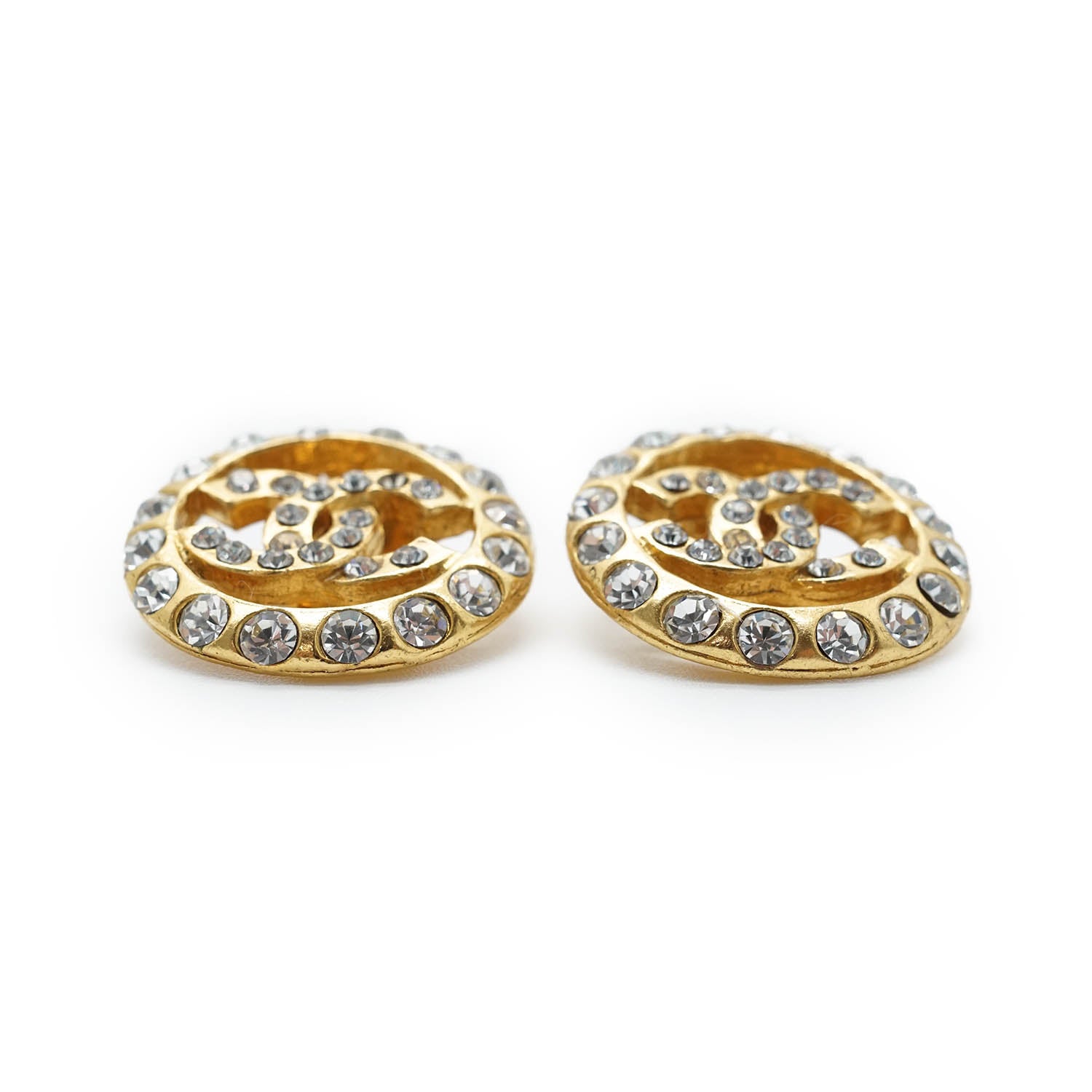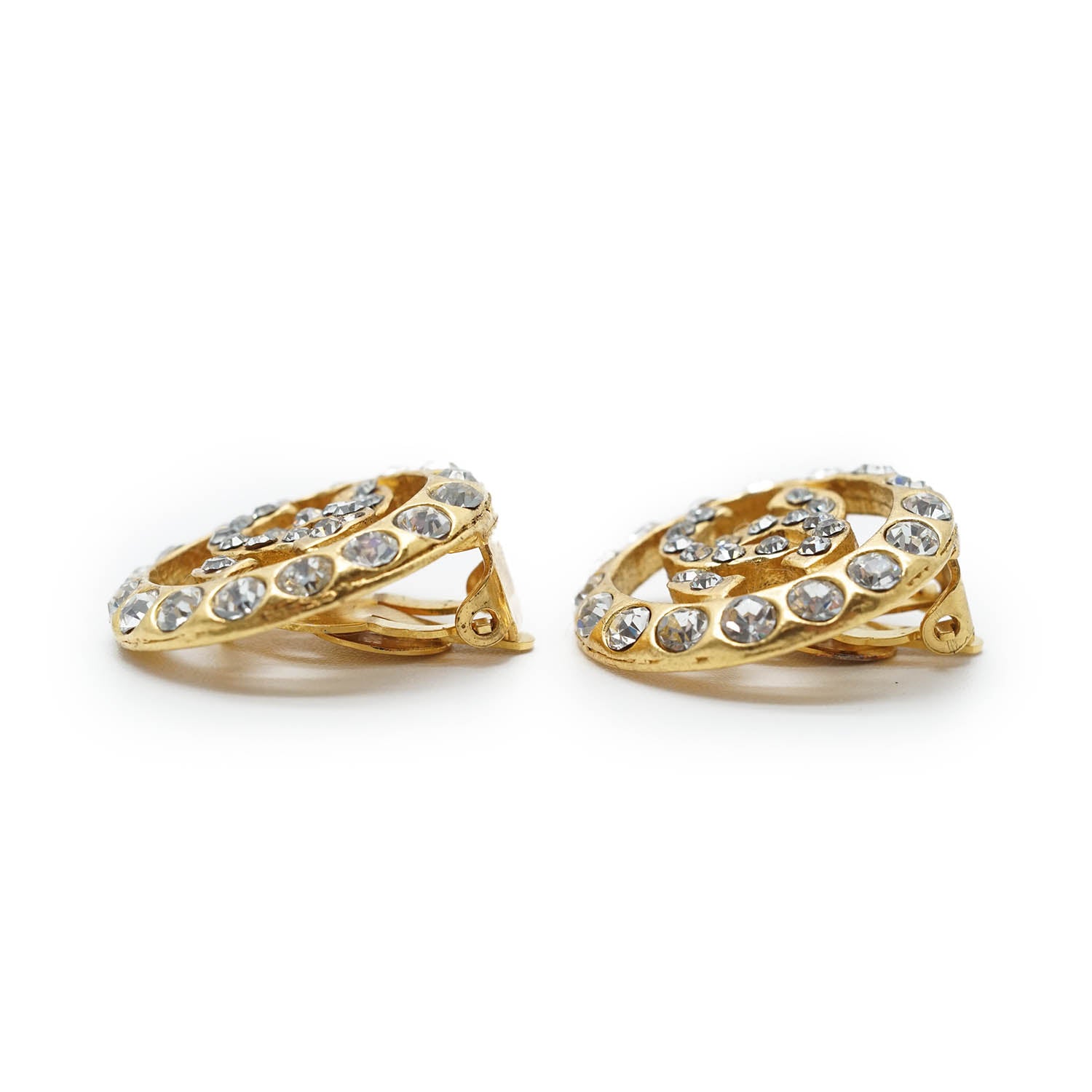 Coco Mark Rhinestone Cut-out Round Clip Earrings Gold Brass
