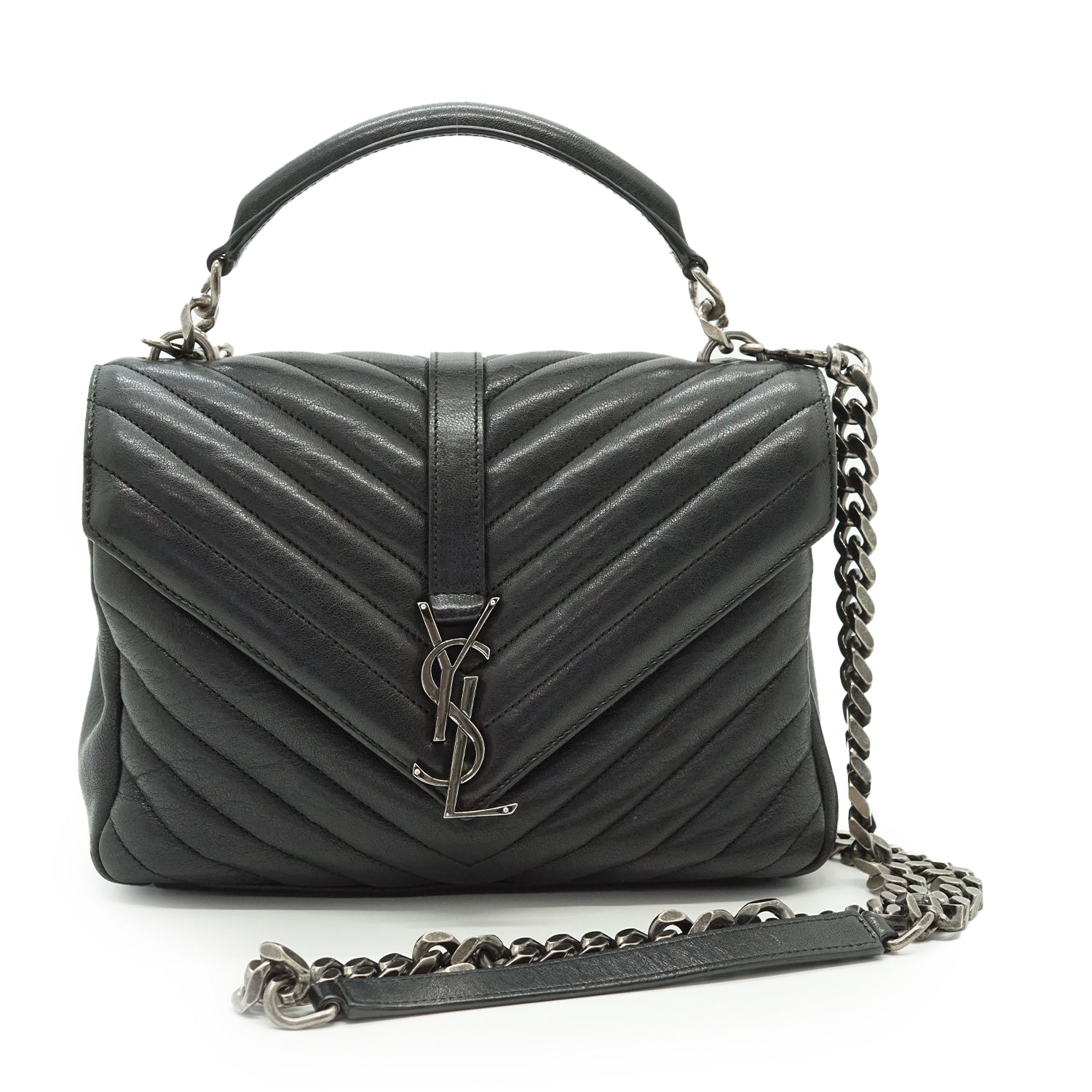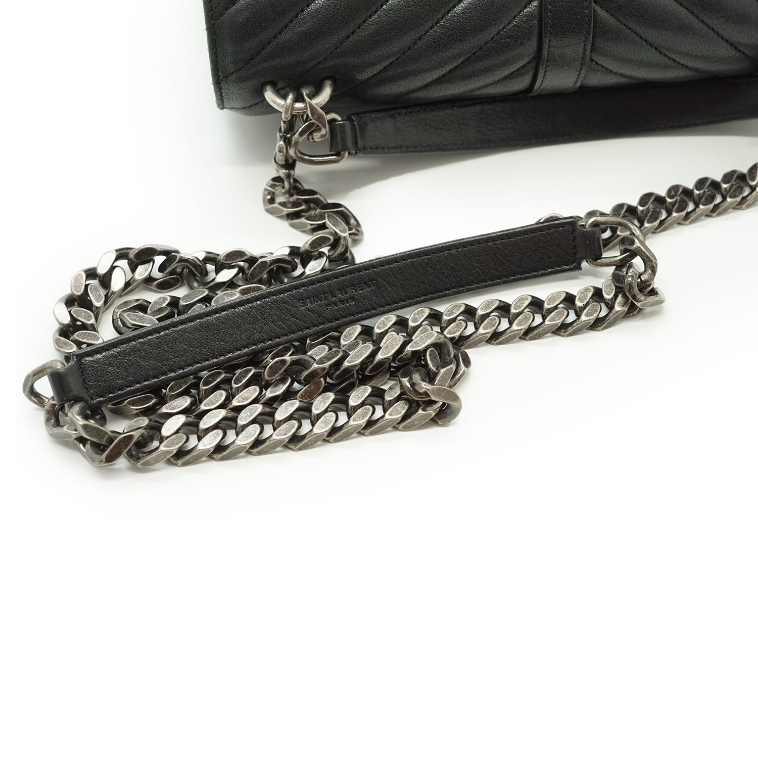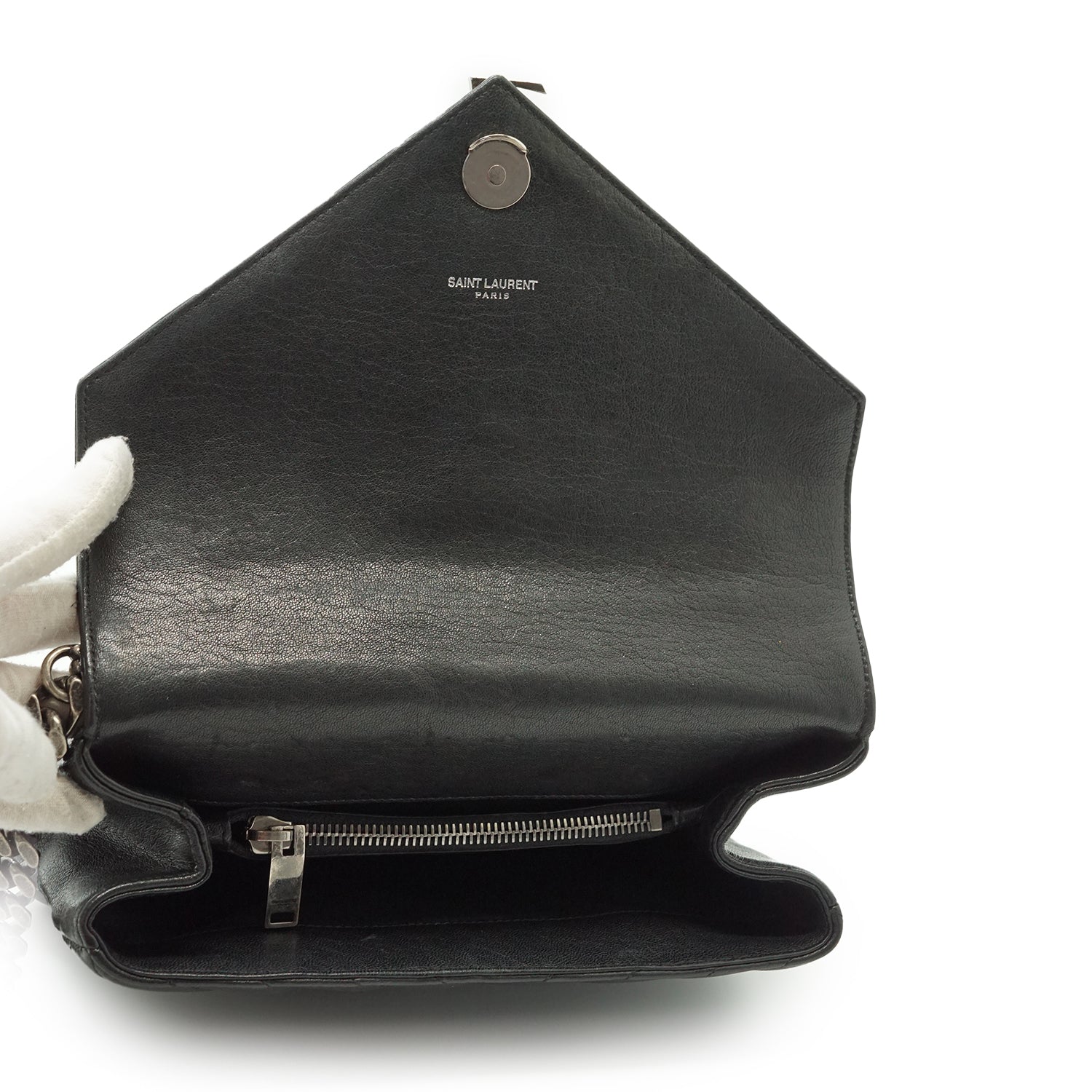 Discoloration: Some hardware tarnish (chain, front YSL logo, zipper pull), slight discoloration on the inside