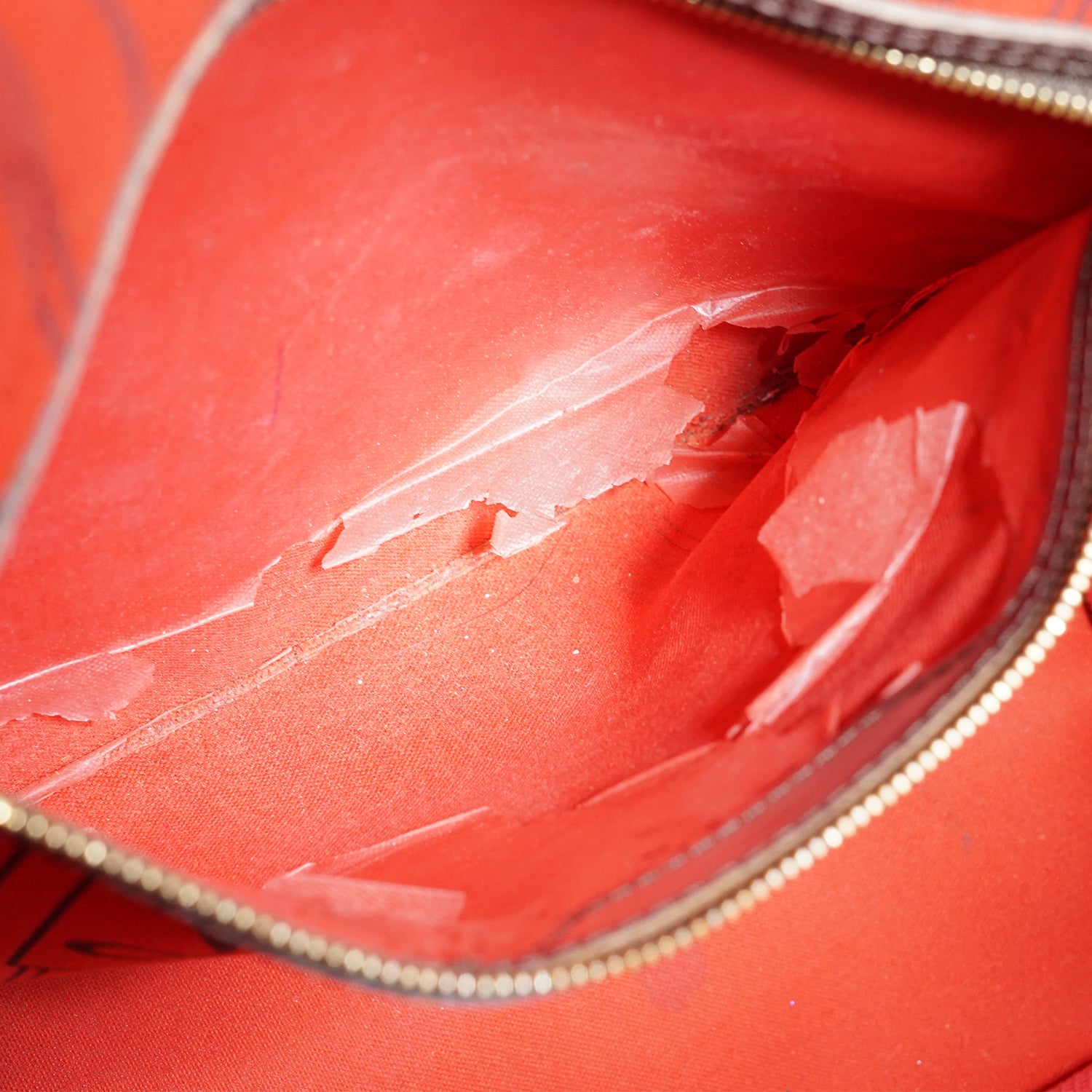 Worn: Visible signs of wear on the inside pocket and one of the side leather drawstring straps