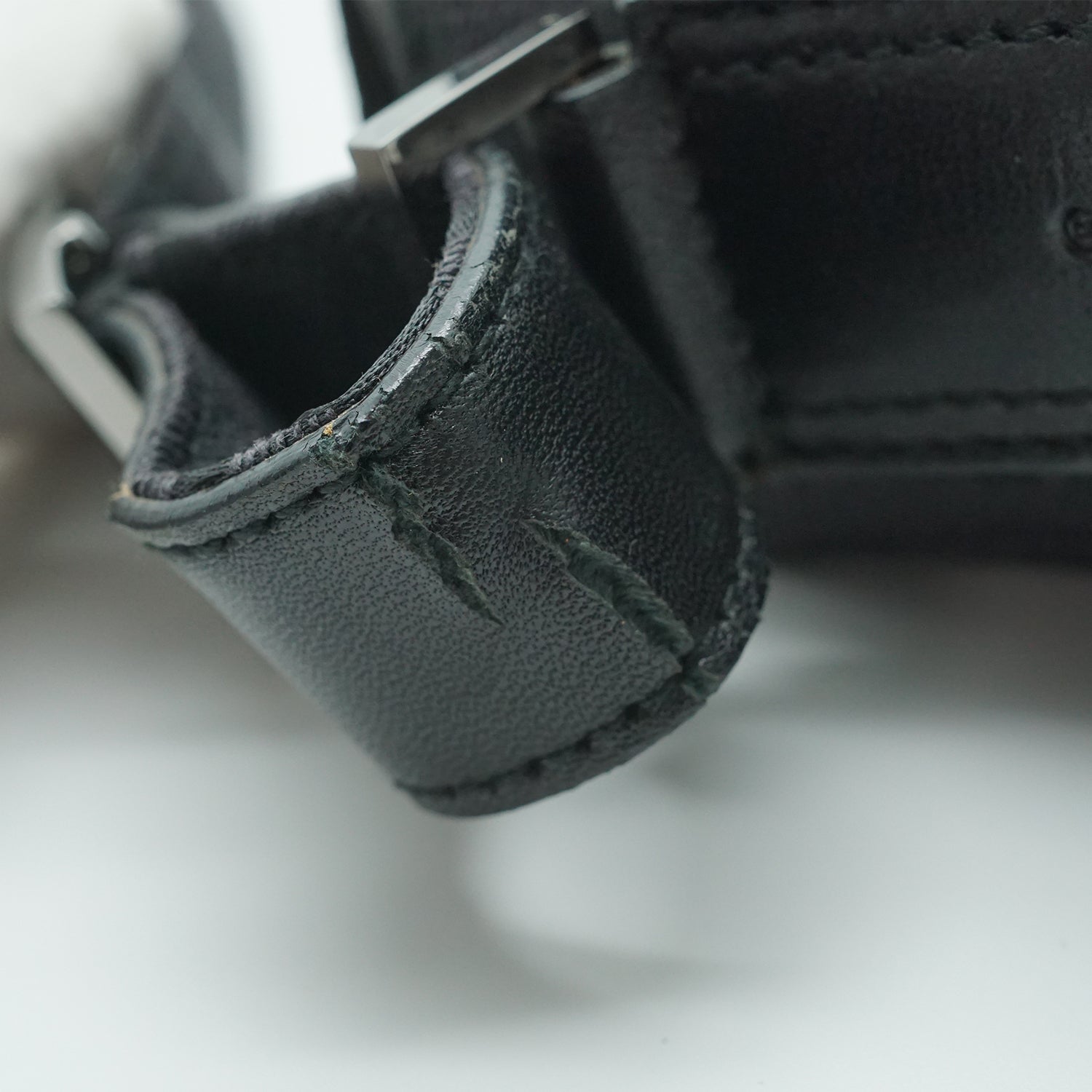 Peeling: Visible leather cracking on the shoulder strap (near the hardware)