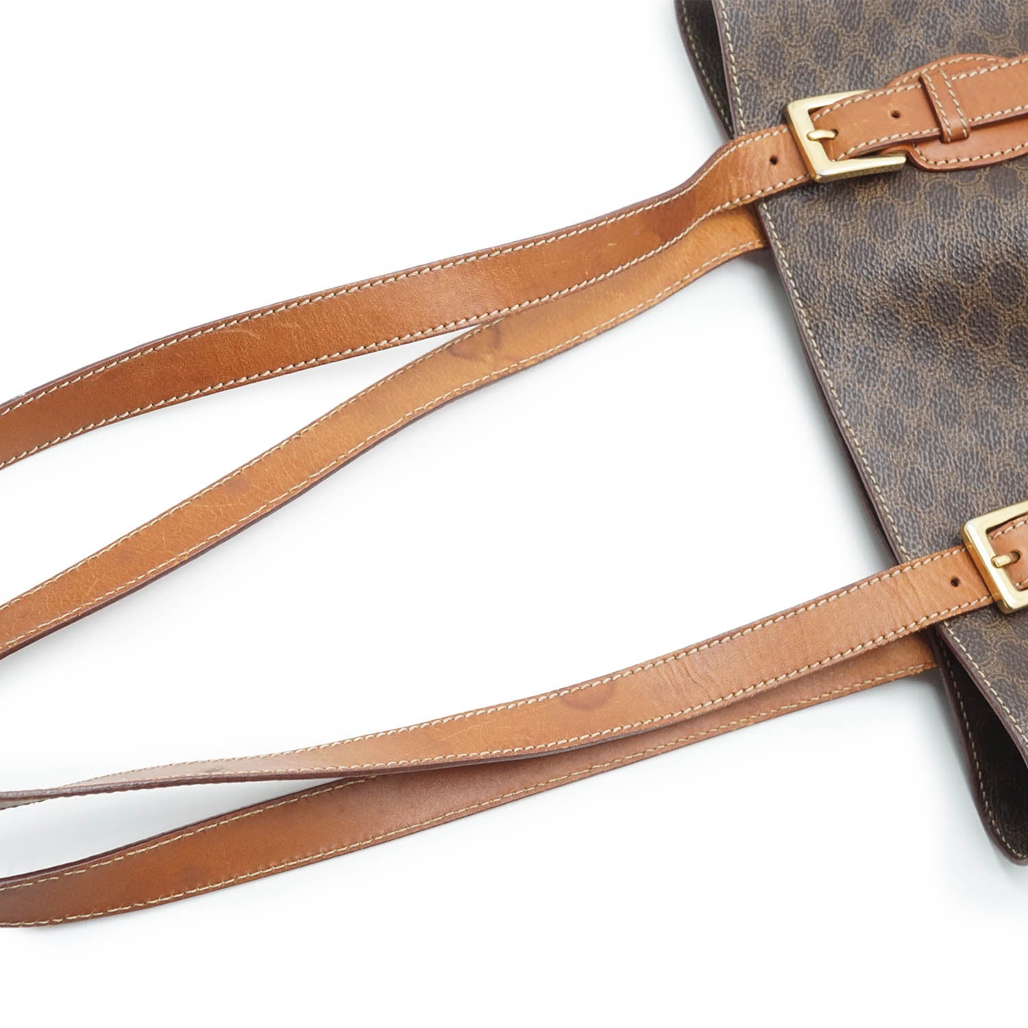 Discoloration: Slight hardware tarnish, overall leather discoloration, discoloration on the canvas caused by hardware (near the strap buckles)