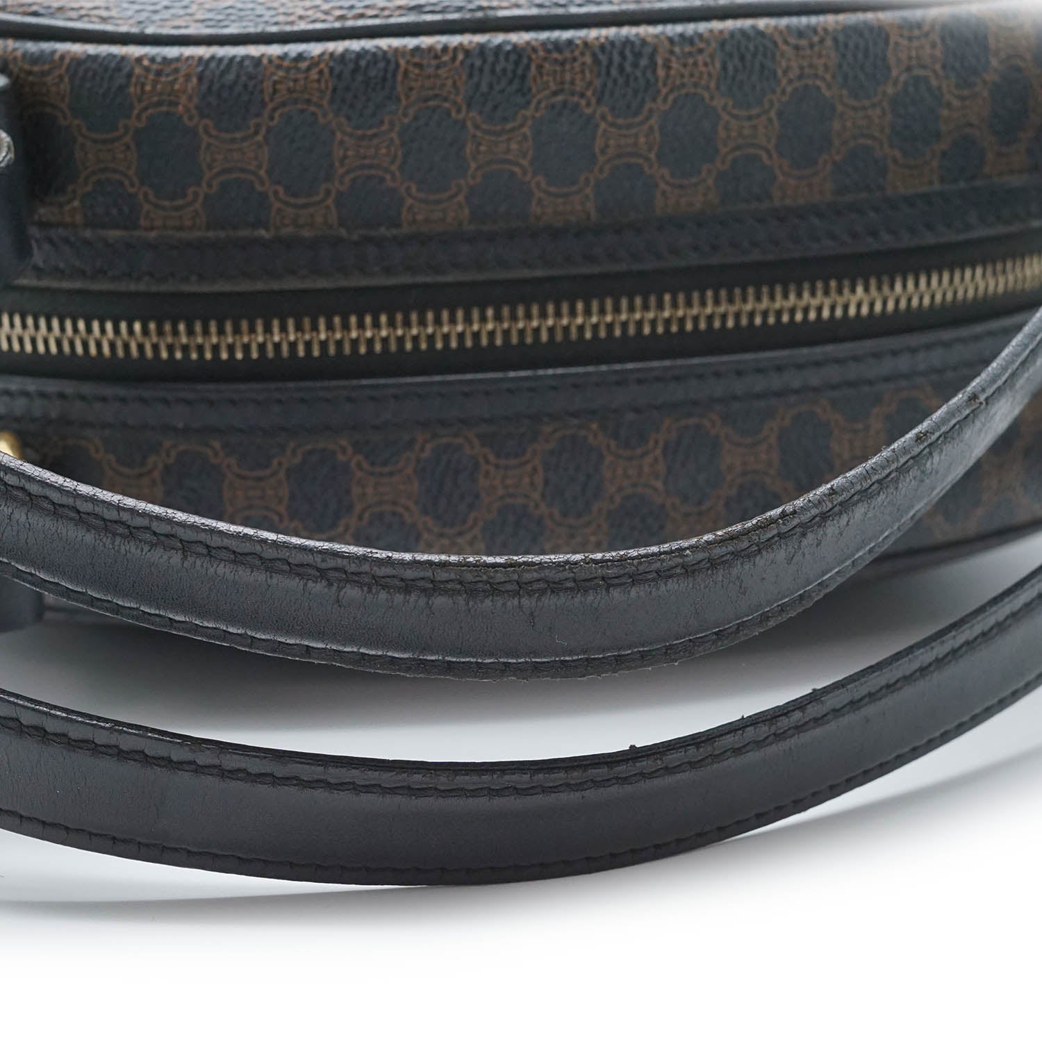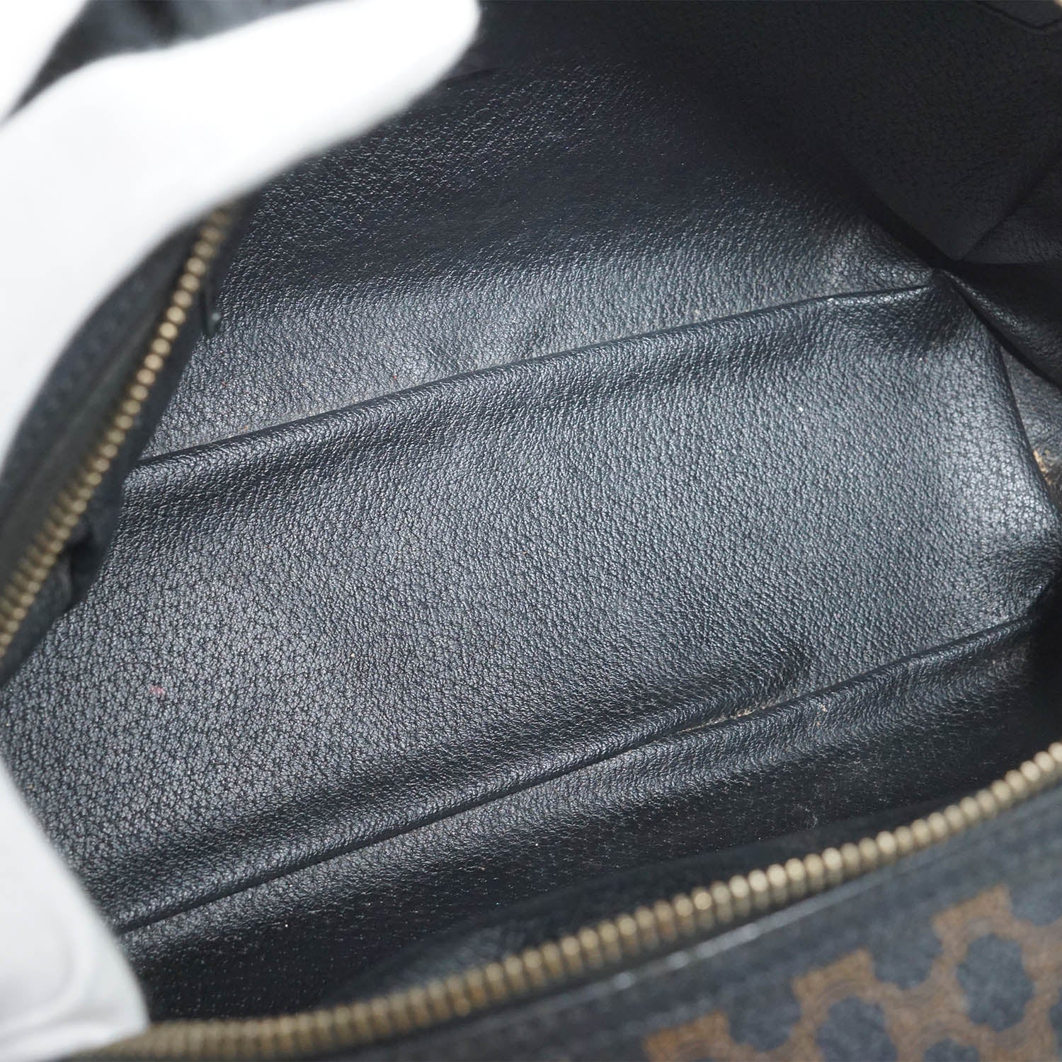 Peeling: Minor leather cracking on the top handles, minor crack on the inside (side leather tab at the zipper base)