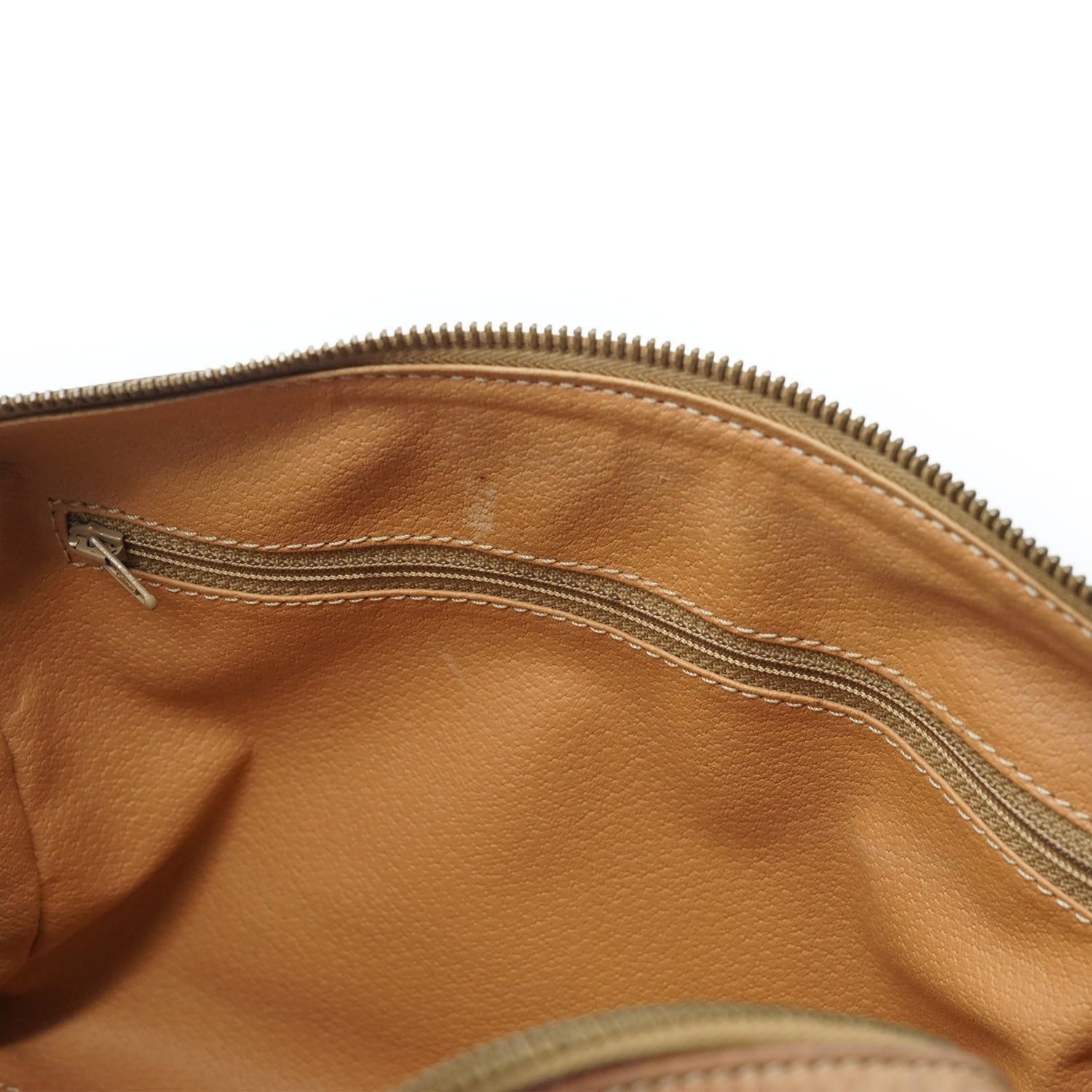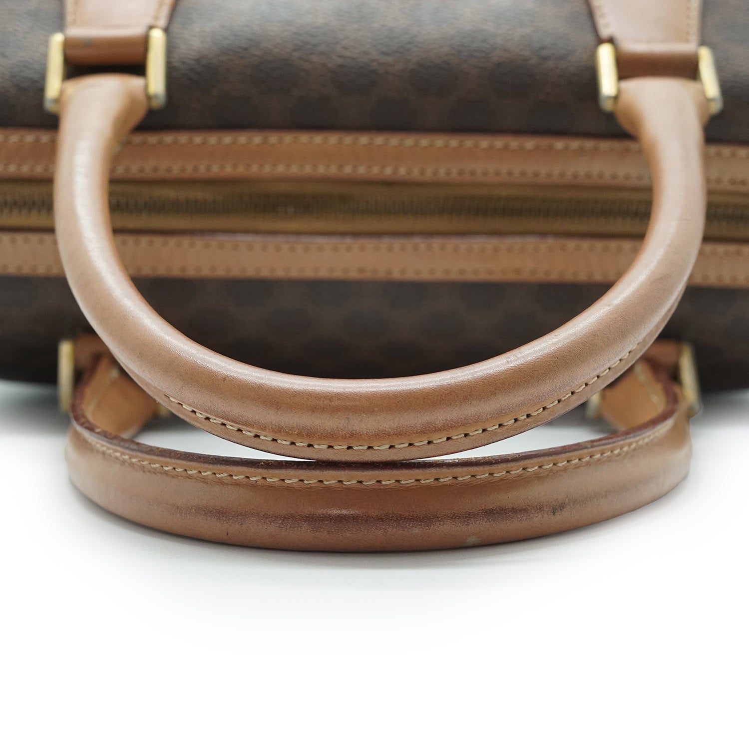 Discoloration: Some hardware tarnish, some discoloration on the leather parts (top handle)
