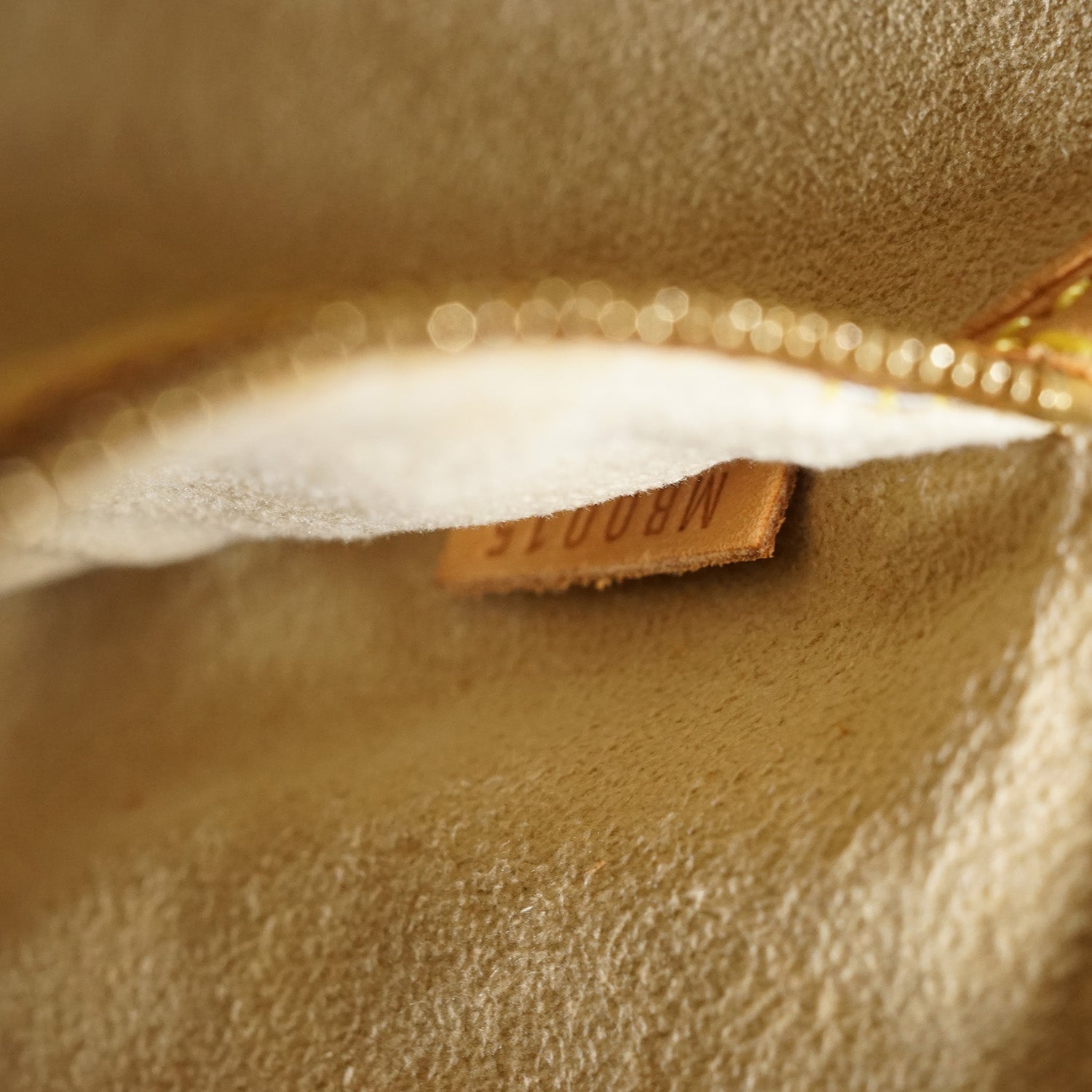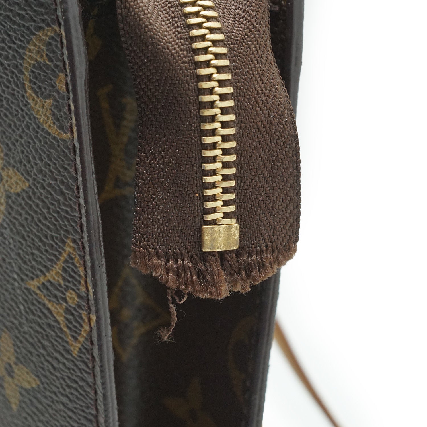 Missing: Leather tab connected to the fabric (near the zipper pull) missing, with some loose threads