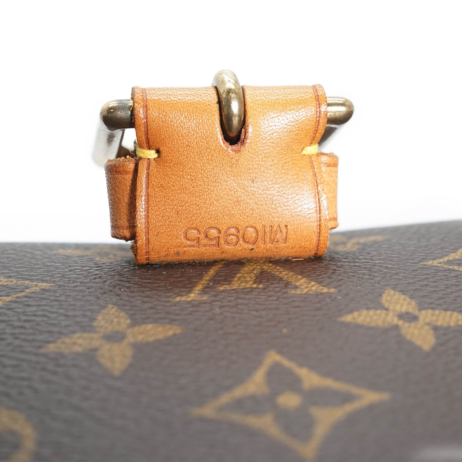 Discoloration: Hardware tarnish (strap), some leather discoloration on the bottom