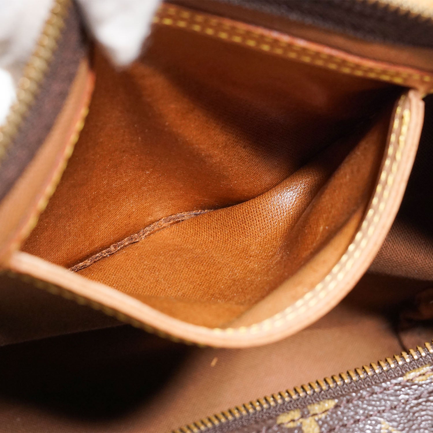 Stain: Some water stains on the leather parts overall, minor black stains on the inside fabric