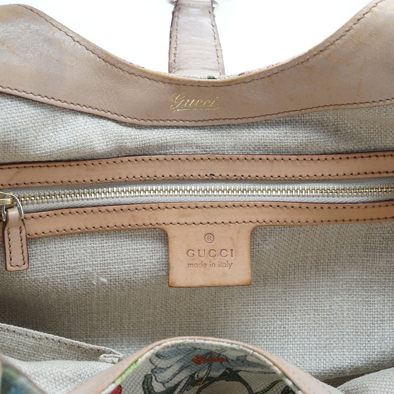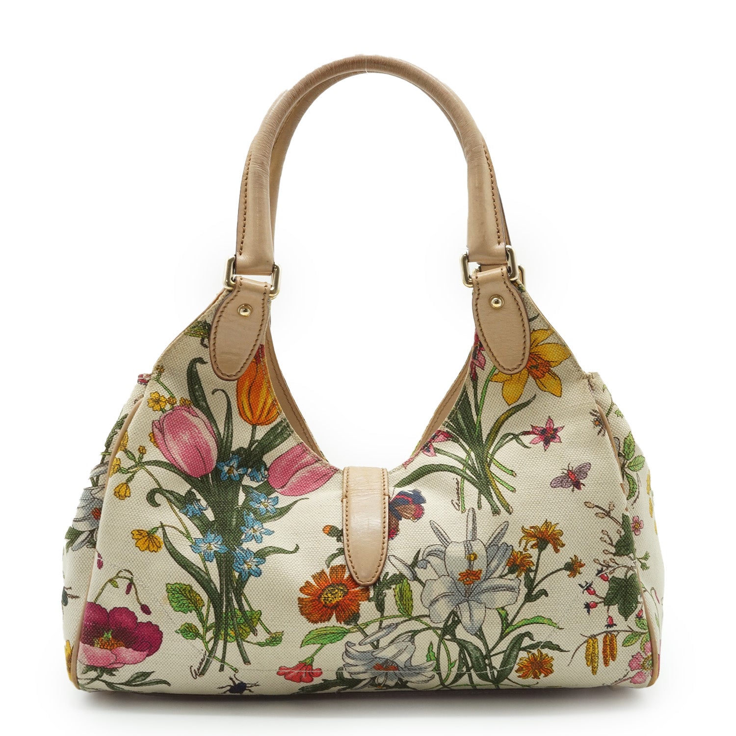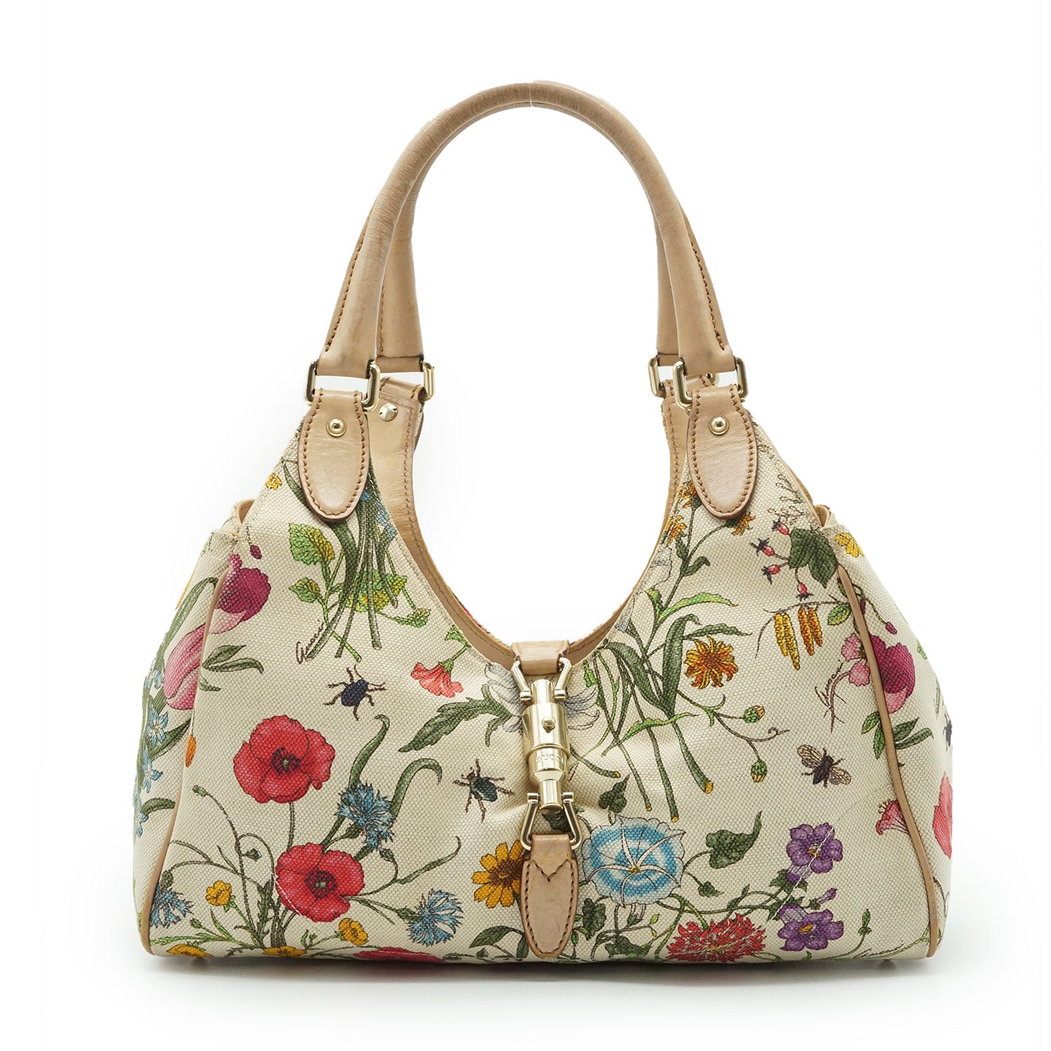 New Jackie Flora Shoulder Bag Beige Canvas, Leather