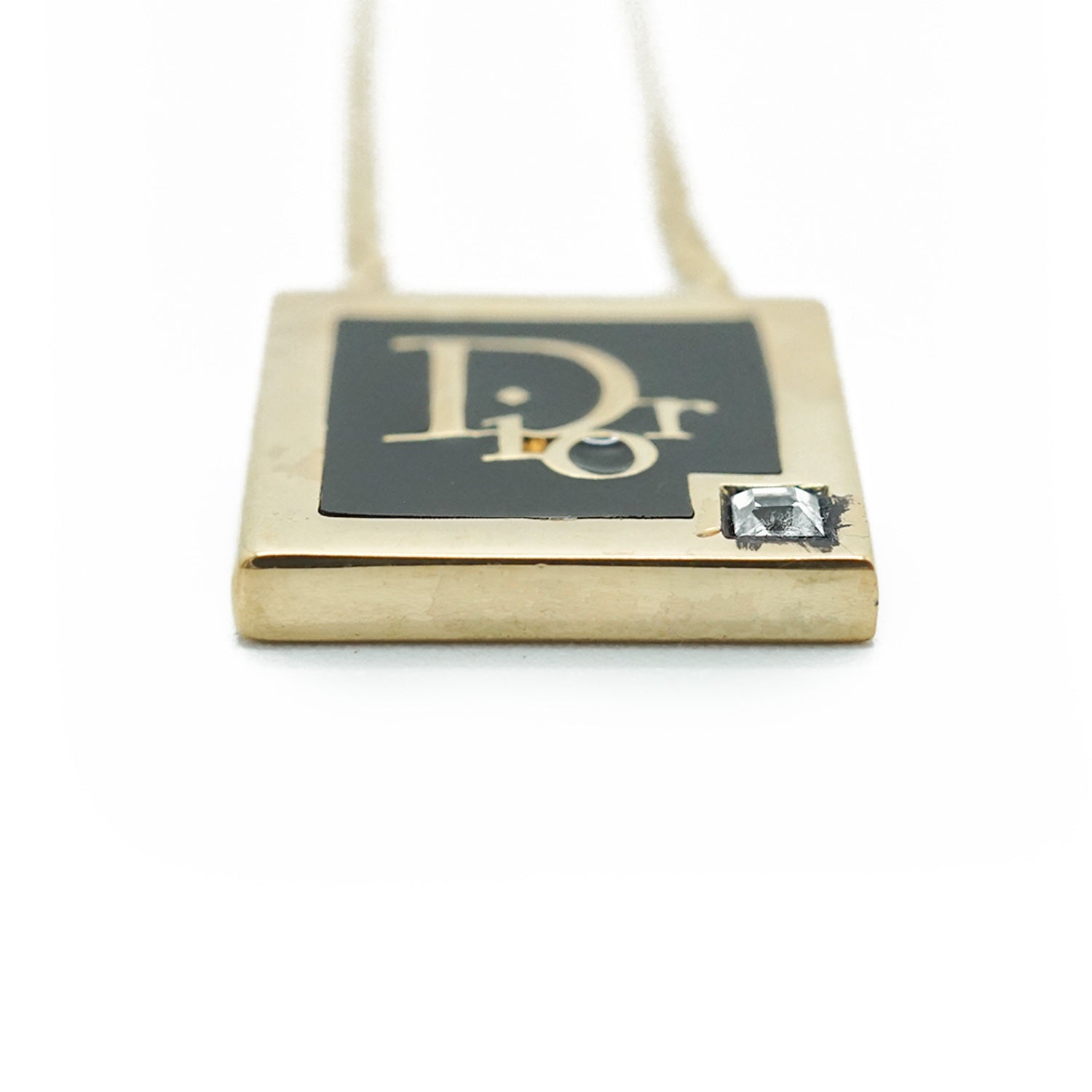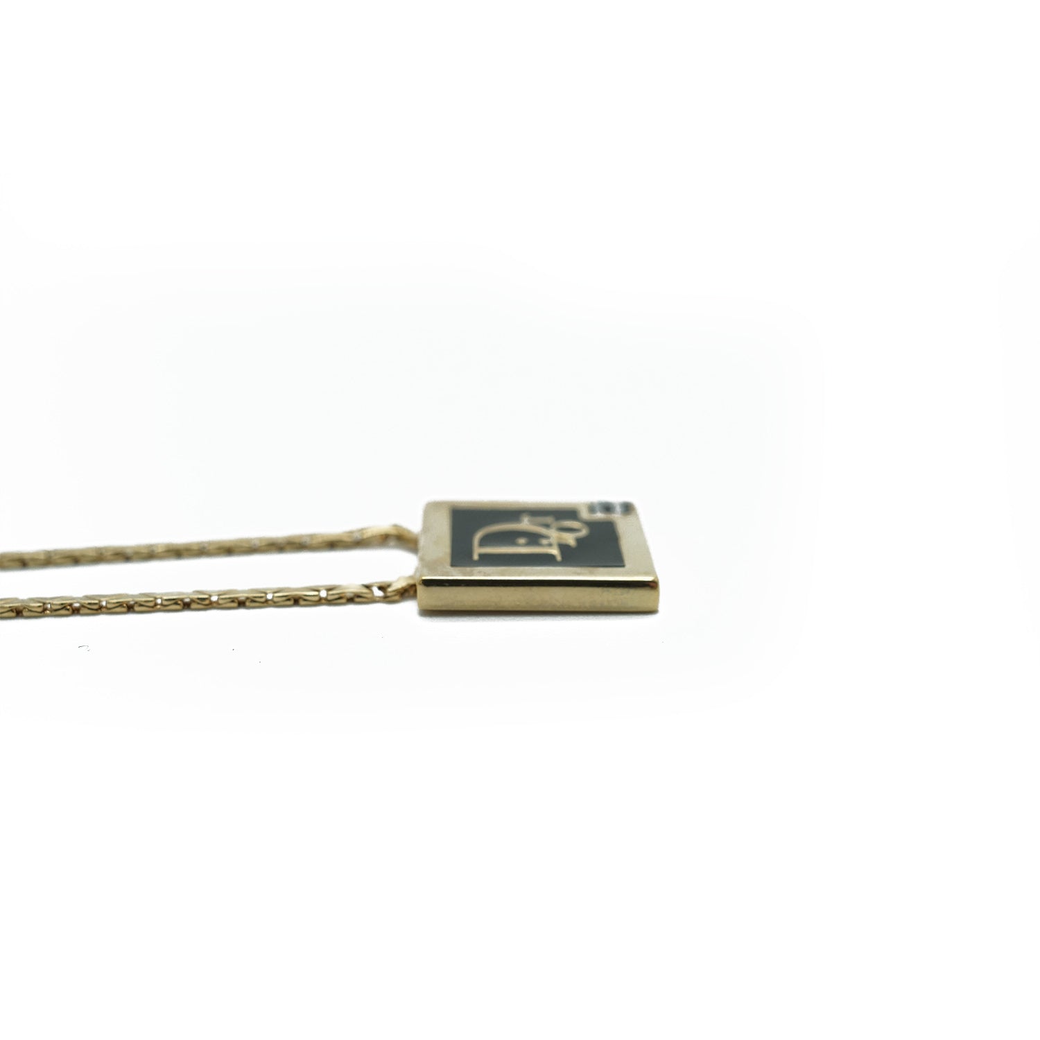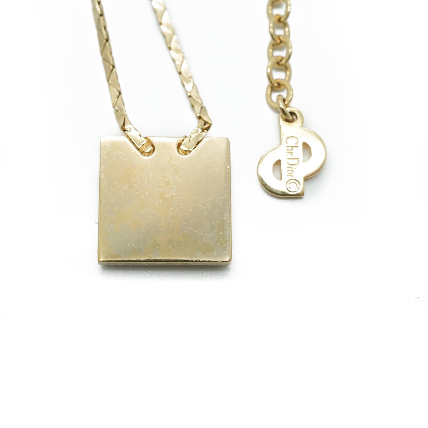 Vintage Dior Logo Square Plate Rhinestone Necklace Gold Brass