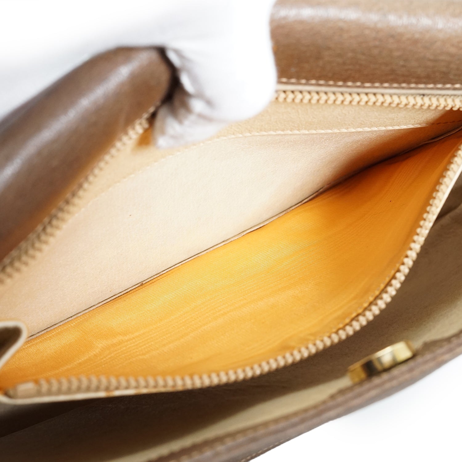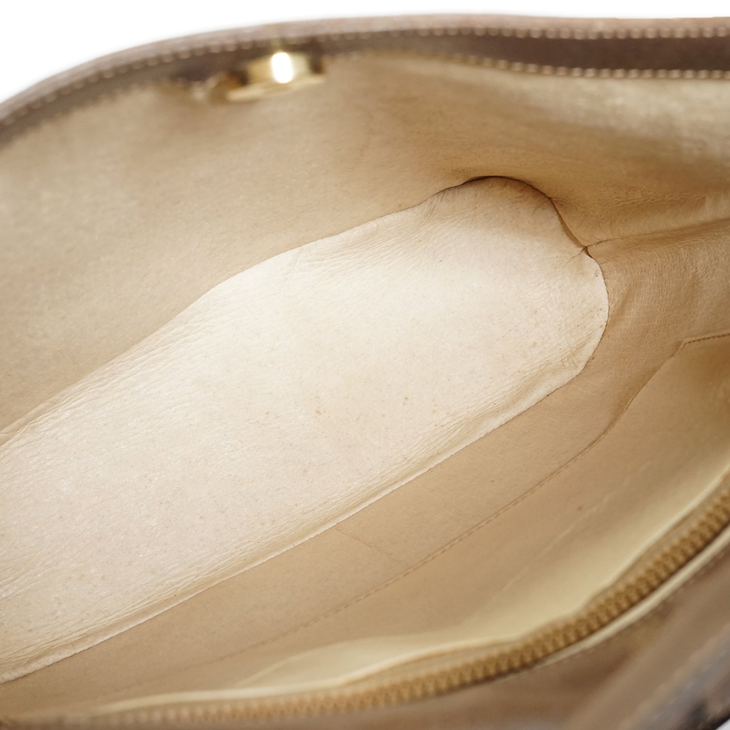 Discoloration: Slight hardware tarnish, minor discoloration throughout the inside fabric