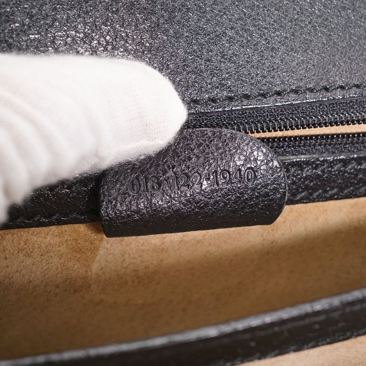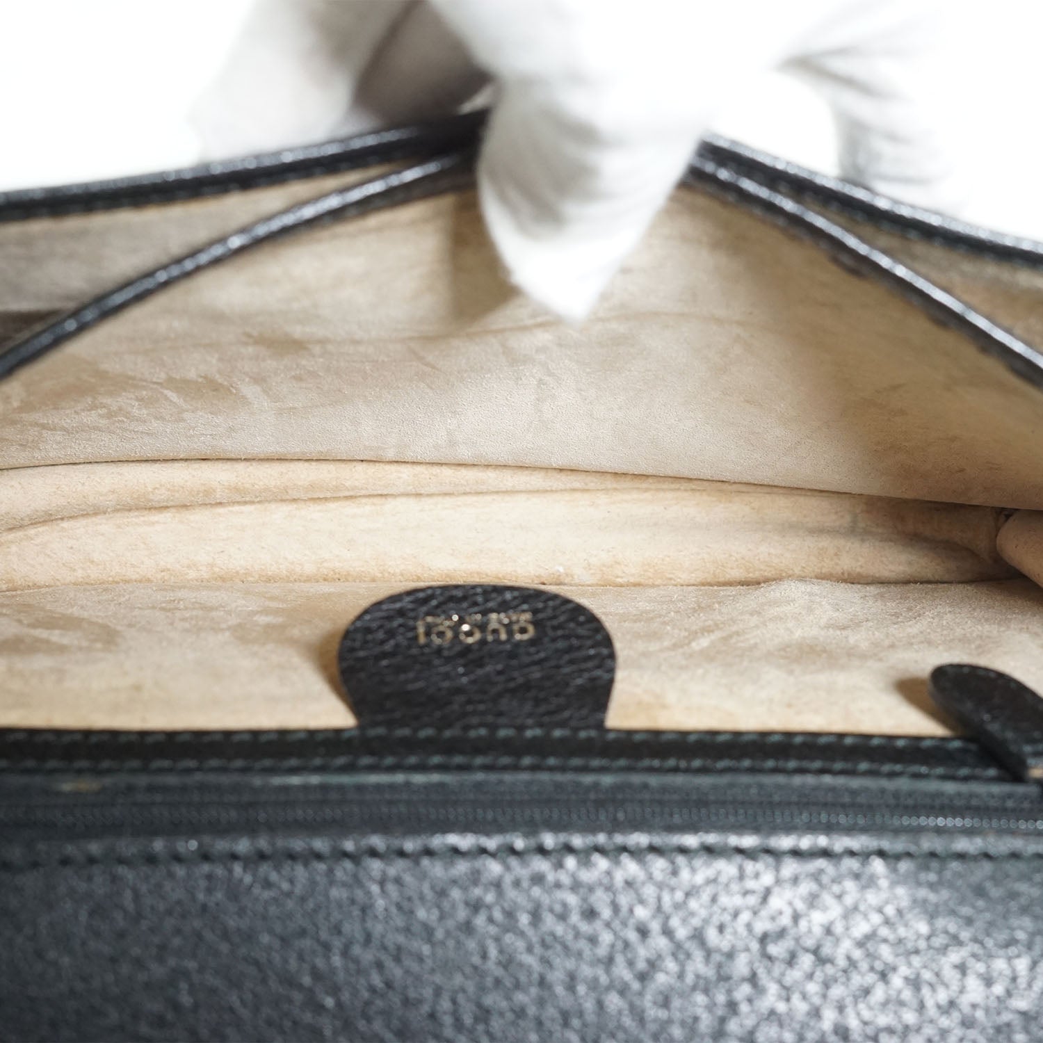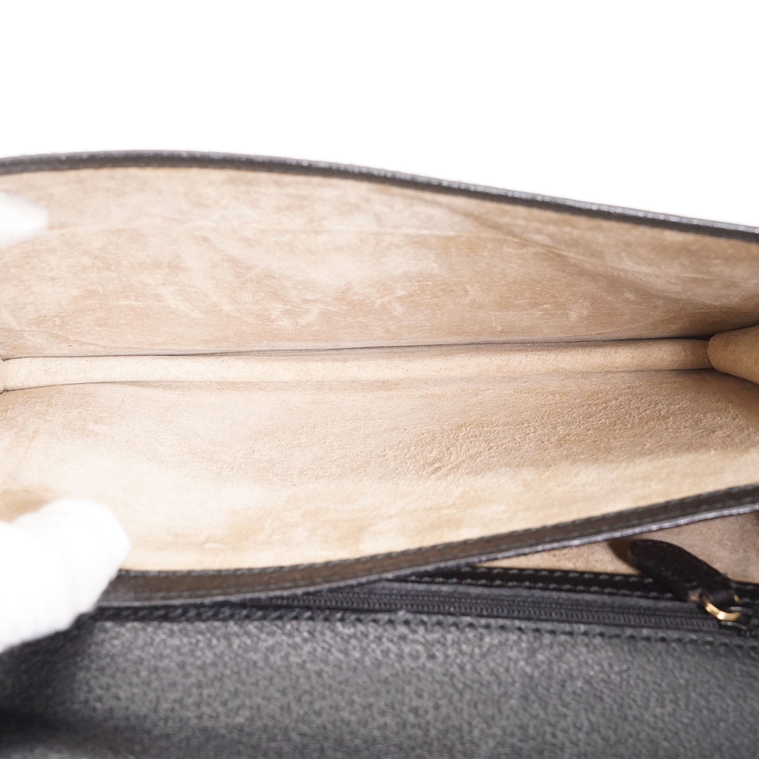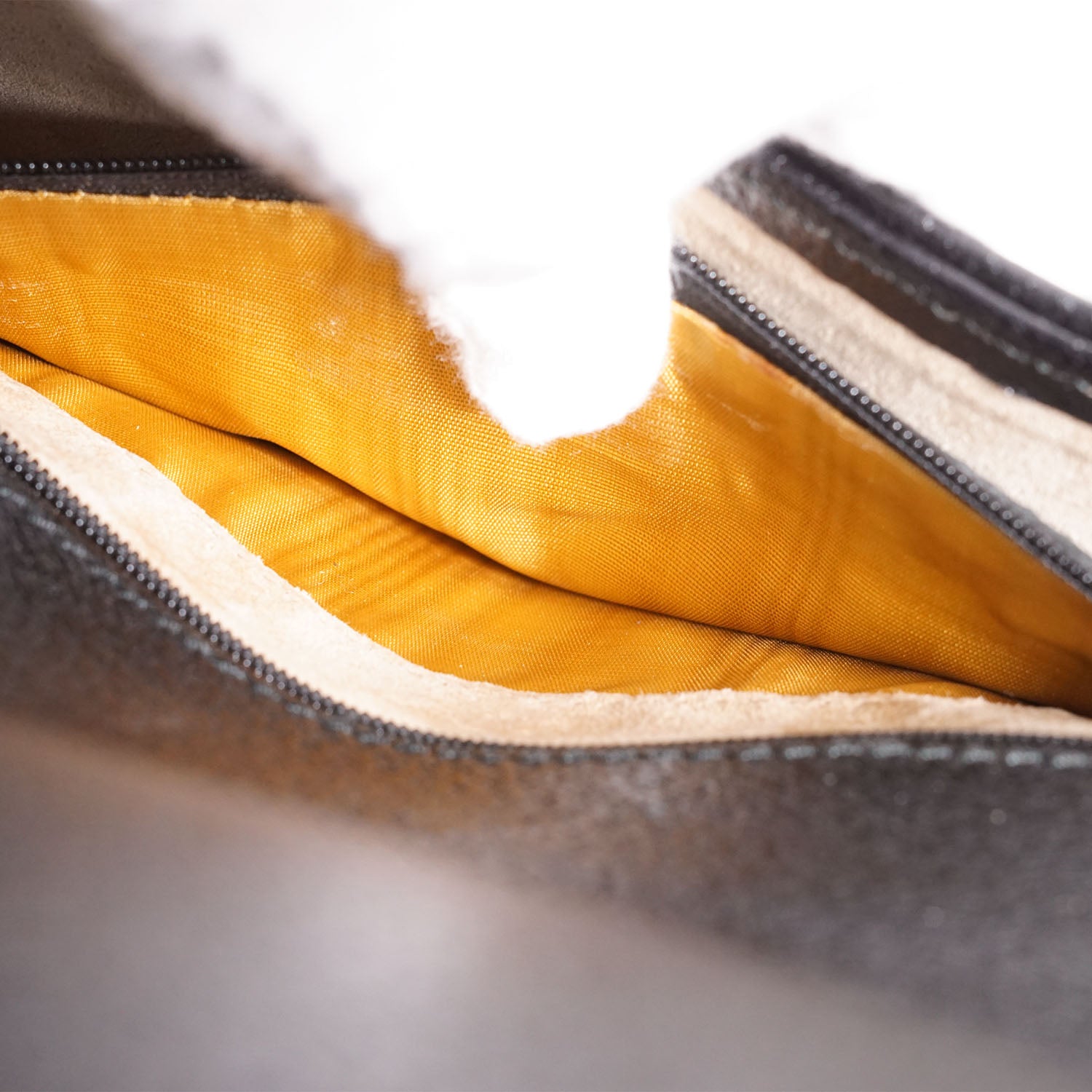 Discoloration: Slight discoloration throughout the inside fabric, slight hardware tarnish