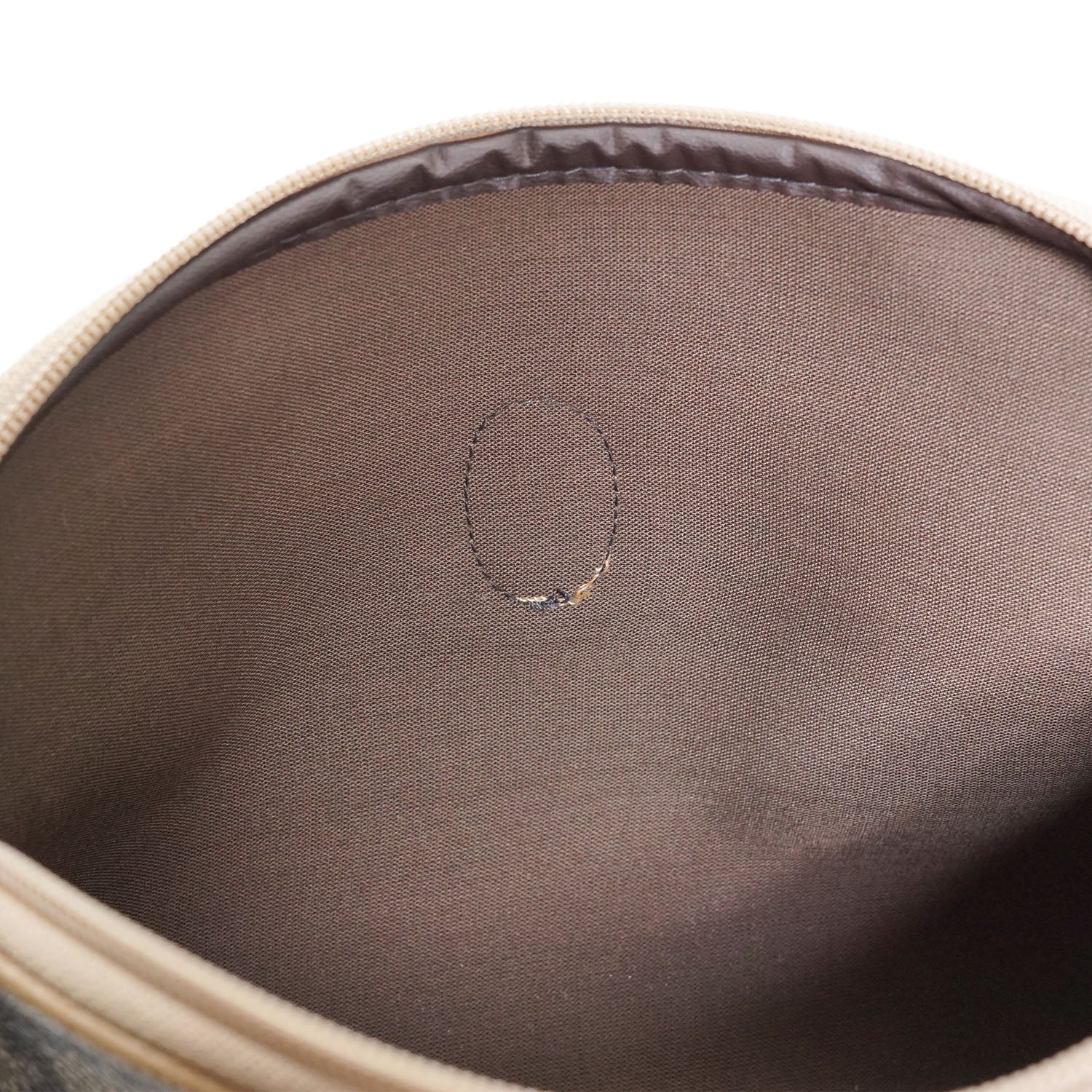 Worn: Minor signs of wear on the hardware, with a few loose stitches on the inside fabric (at the back of the leather logo)