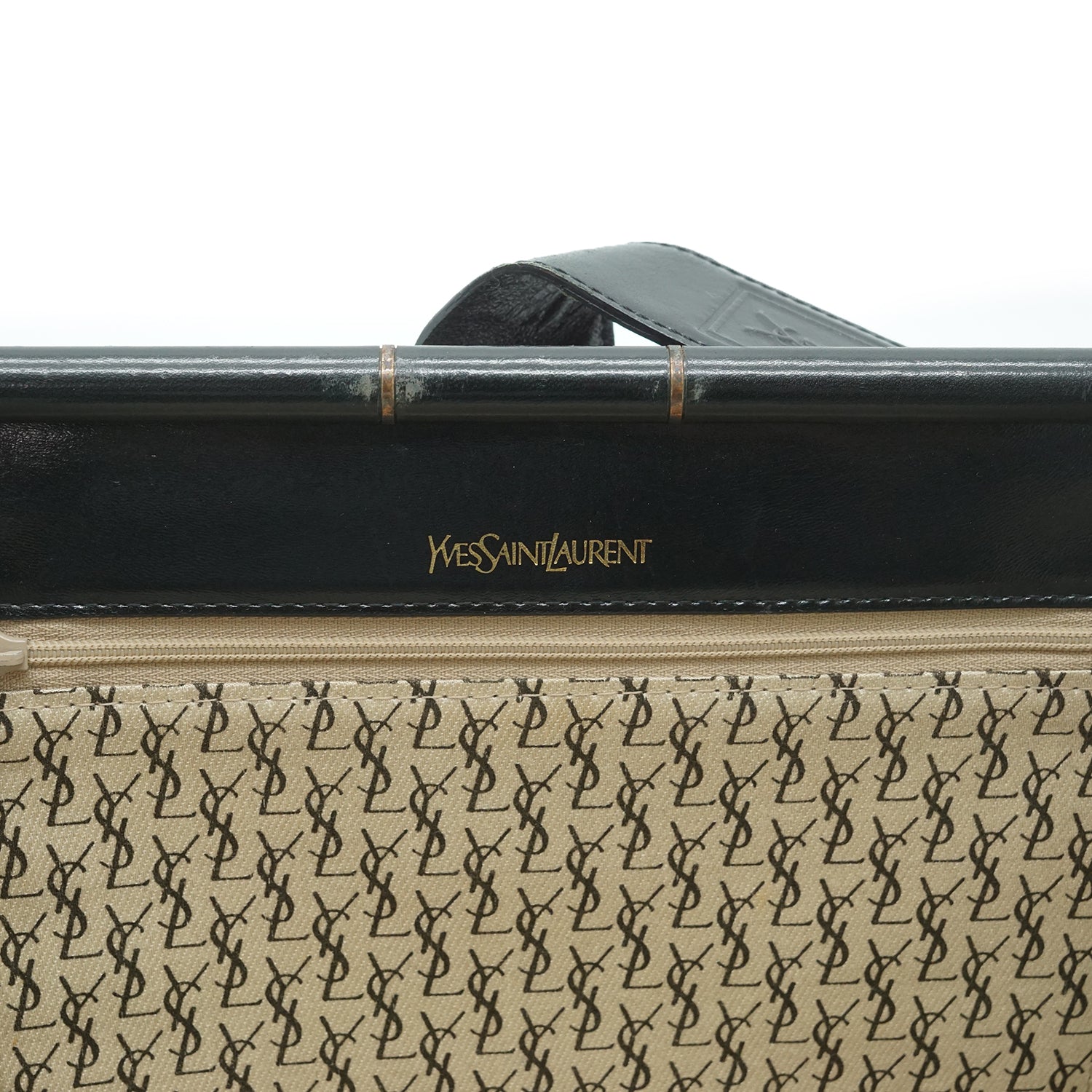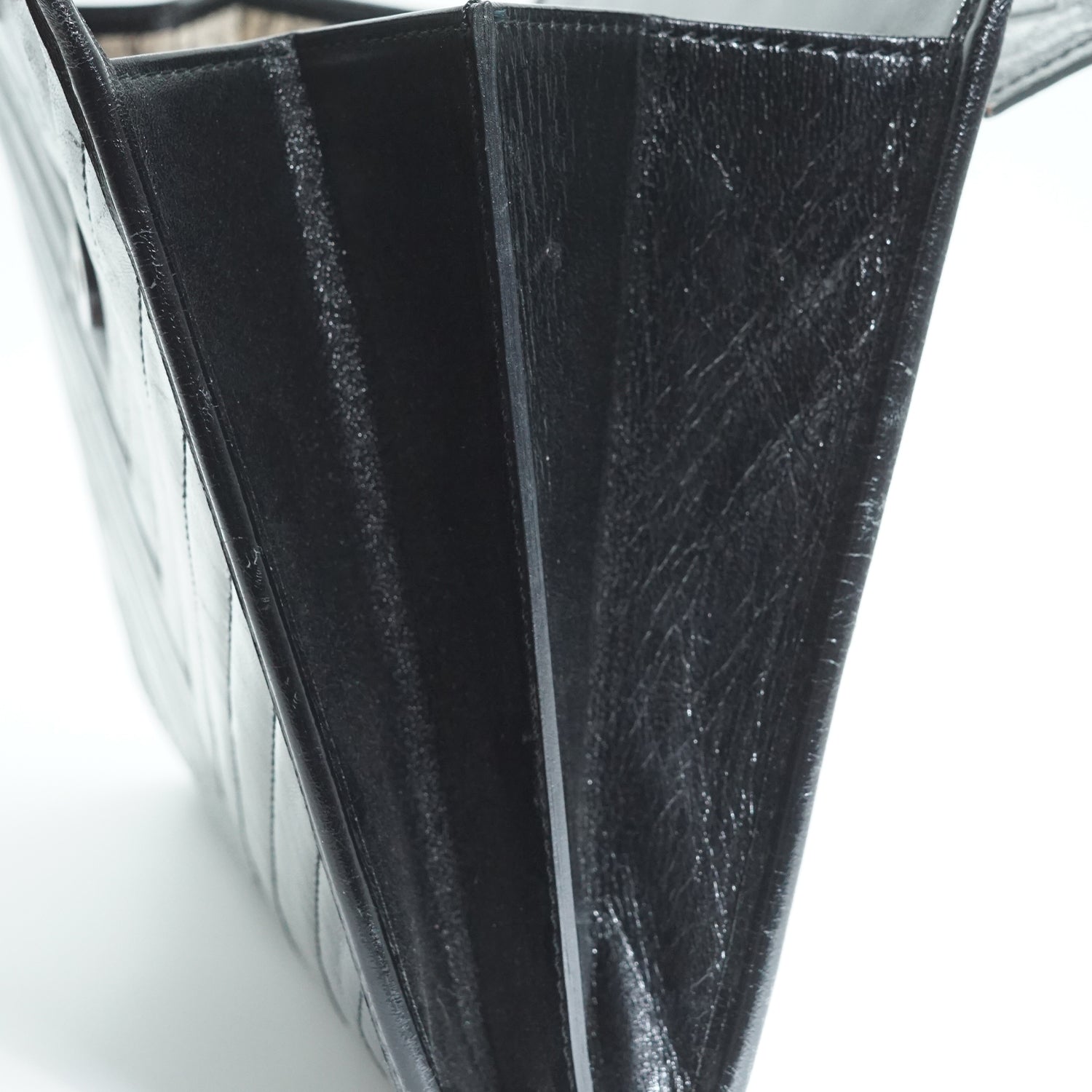 Discoloration: Hardware tarnish, slight leather discoloration at the top